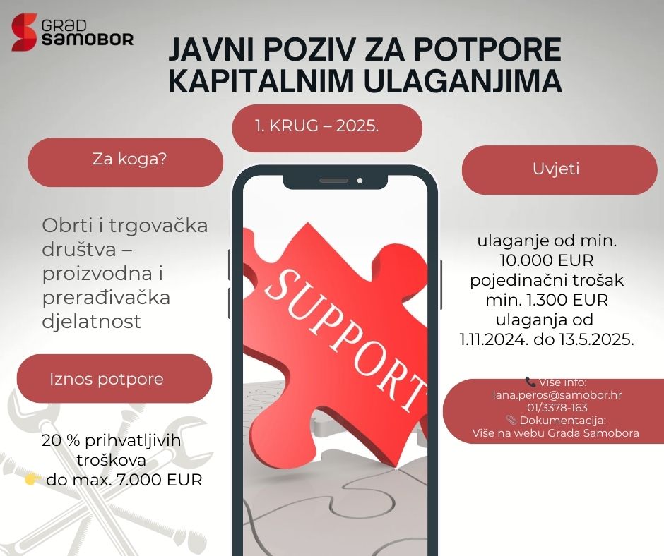 Grad Samobor objavio je Javni poziv za dodjelu potpora kapitalnim ulaganjima u proizvodnom sektoru, namijenjen subjektima malog gospodarstva koji djeluju na području grada.