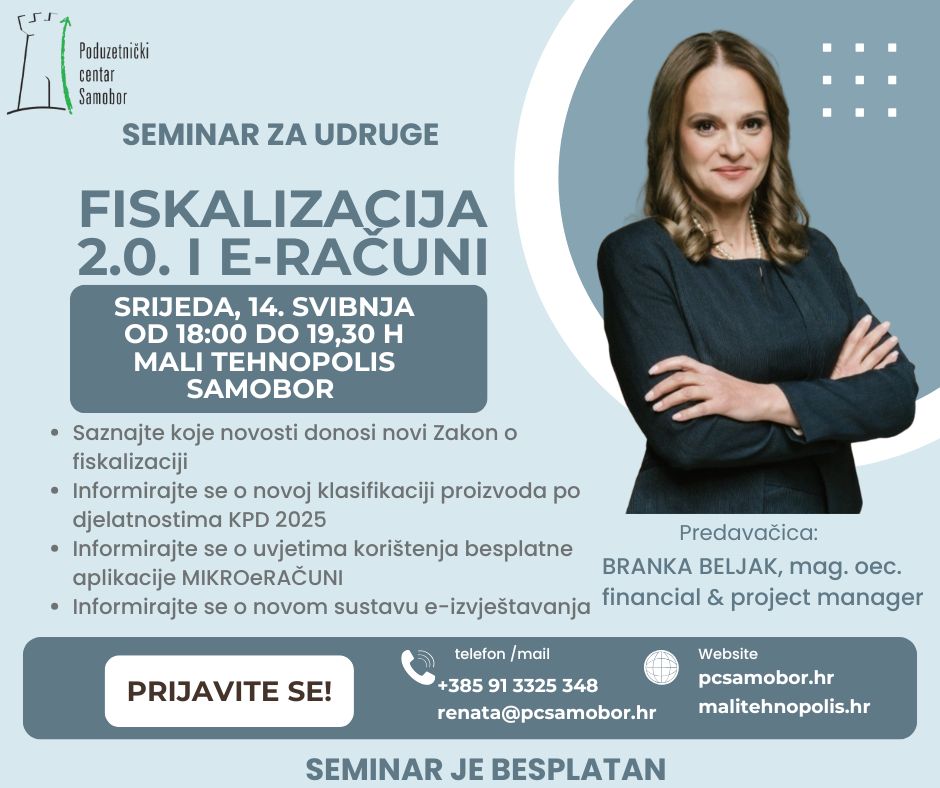 Poduzetnički centar Samobor organizira besplatan seminar za udruge na temu velikih zakonskih promjena koje donosi novi Zakon o fiskalizaciji. Seminar će se održati u srijedu, 14. svibnja 2025. godine s početkom u 18:00 sati, u prostorijama Poduzetničkog centra Samobor (Vladka Mačeka 7, Samobor).